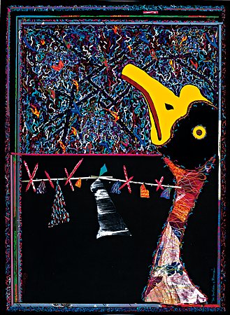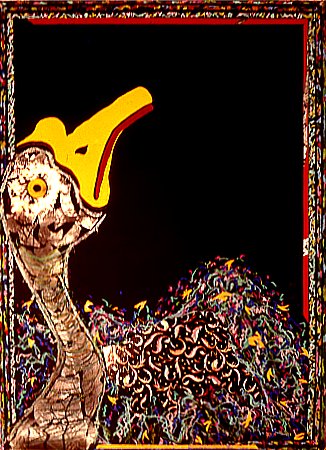 The duck stares outward with a neck of flaming red and orange made from viscosity printing. It attests to a horror of fire created by a gestural field engulfing diverse abstract forms and fragments: a landscape of total dissolution.