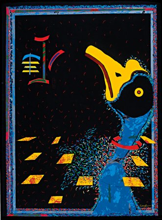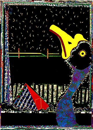 Simons used this image in over a dozen works. Self-consciously, in every piece, the bird stares out at us with one eye. Its enlarged scale makes it somewhat heroic in stature, assuredly assertive yet vulnerable and insecure. This dichotomy is Simons' metaphoric foundation for the series. My conclusion is that it is a stand-in for the artist himself acting as both observer and participant.