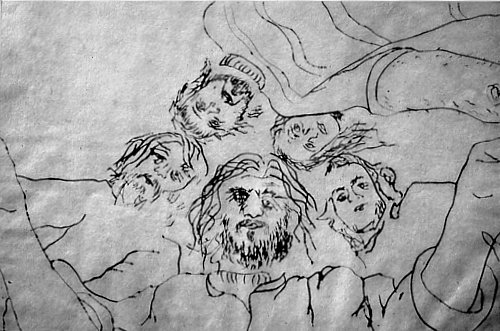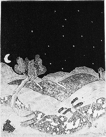 Examples included in this exhibition are "Earth Altarpiece" (1972) consisting of nine plates printed simultaneously, including a schematic figure perched on a cliff in front of a moon. Landscape predominates as the work abides by Asian principles of the diminution of the figure. Here Simons, master printmaker, chooses a medieval altarpiece format with Bosch-like references in the minutiae represented.